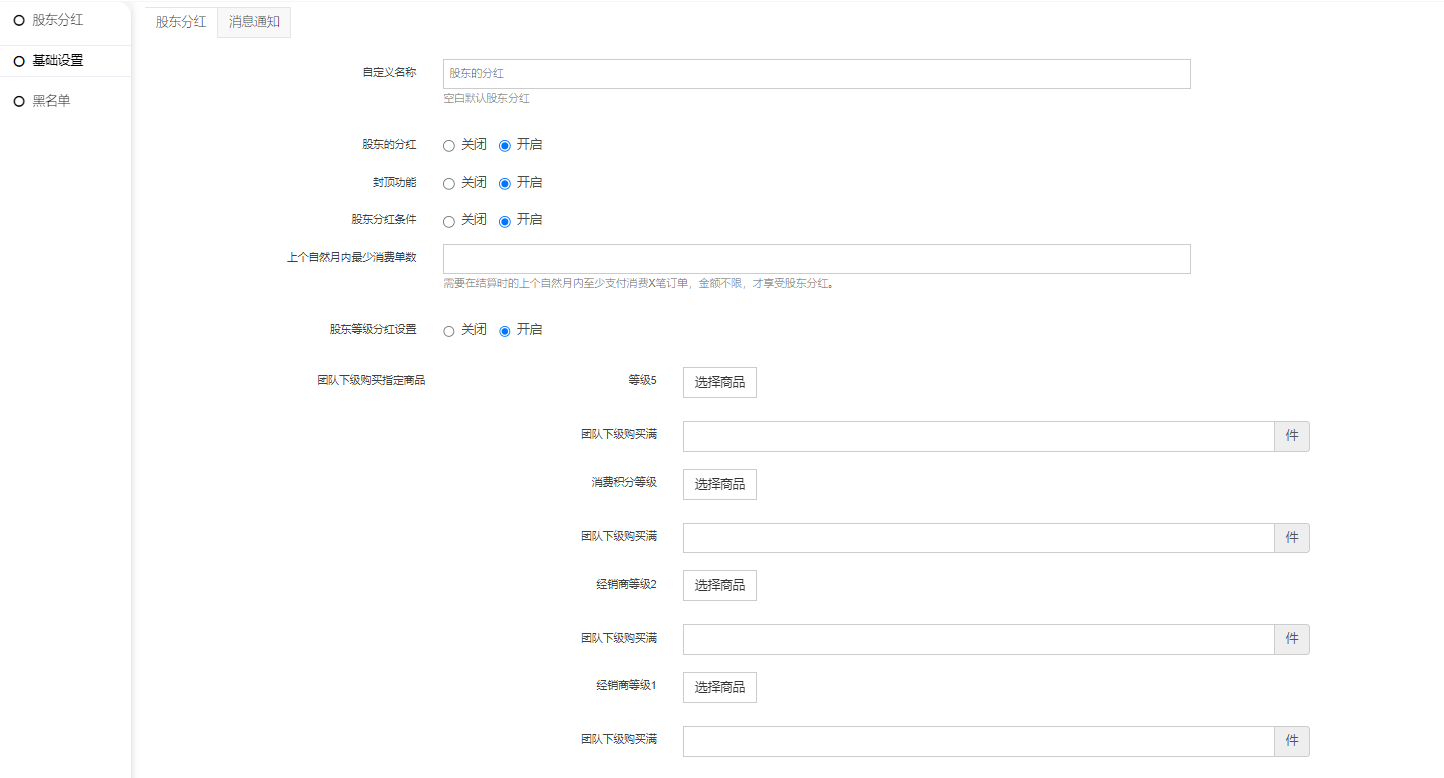 5、股东等级分红设置:开启股东等级分红设置,团队下线购买指定商品:需要订单完成收货后。这里的团队下级购买满(是指团队下会员订单加起来满30件即可)