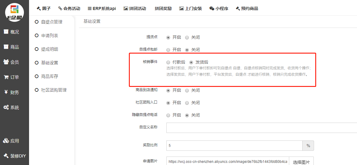 路径:商城后台 -- 应用中心 -- 自提点 -- 基础设置 -- 开启社区团购入口